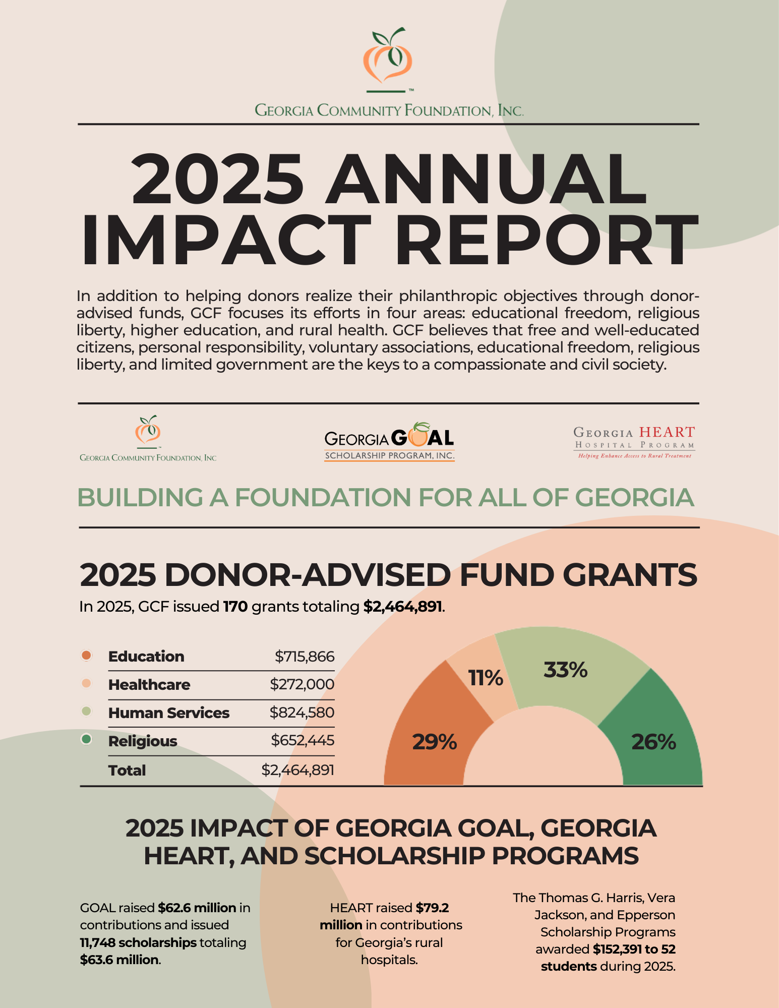 The mission of Georgia Community Foundation, Inc. is to promote and support charitable and educational activities in Georgia and to provide philanthropic advice and charitable giving services to individual donors and, when designated, members of their families.